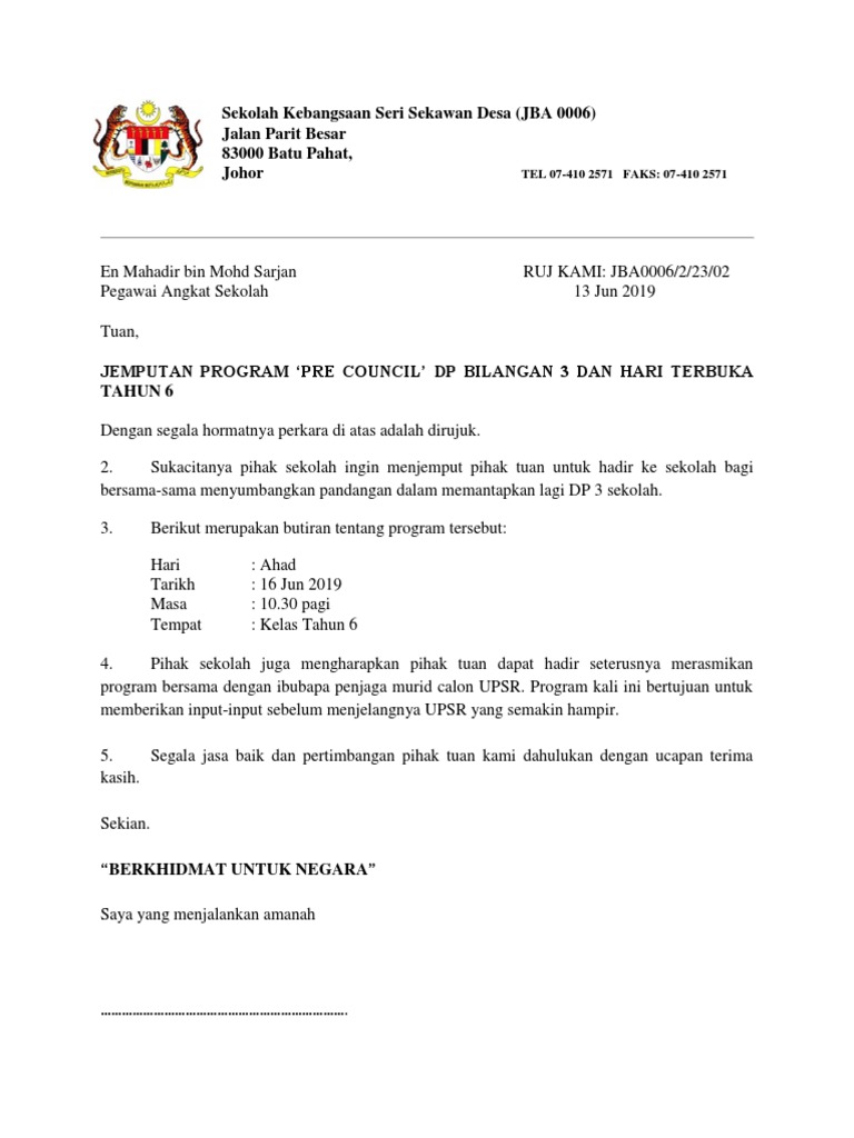. Makluman aktiviti sukan olahraga dan kokurikulum. Contoh Surat Rasmi 2022. Surat jemputan program jom ke sekolah skpm ydp pibg Muhammad Mukhlis.